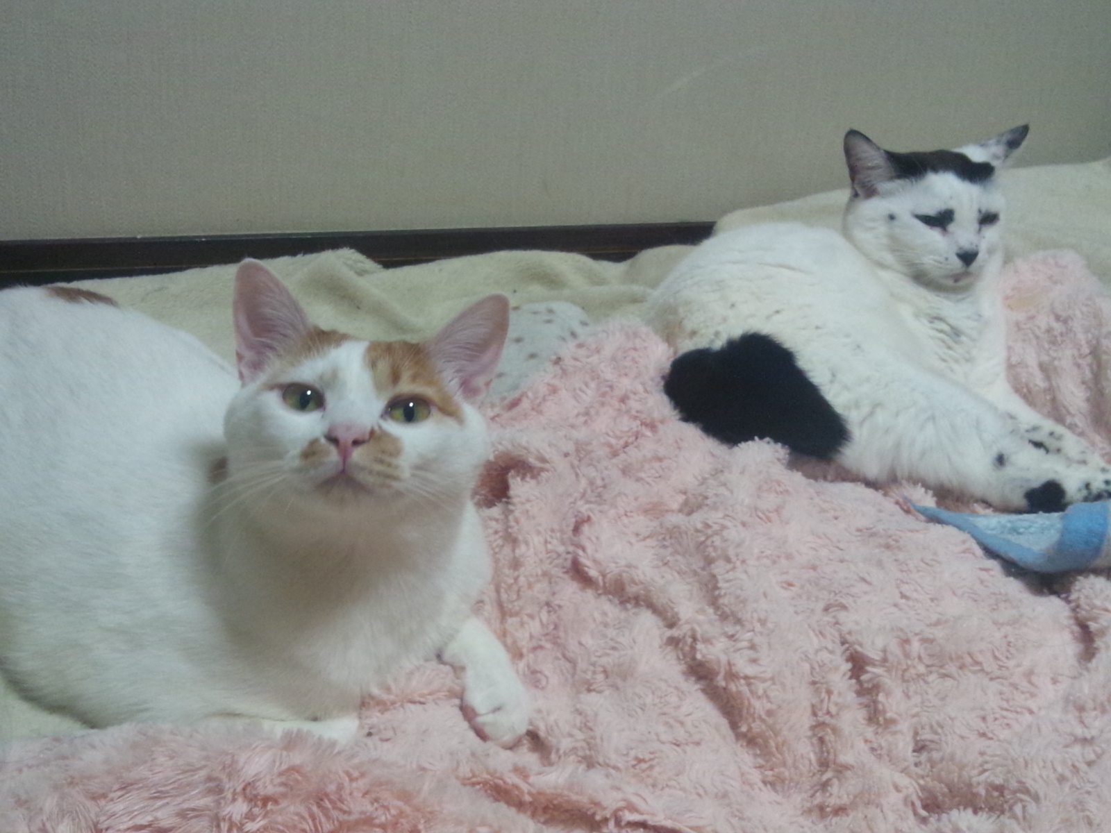 さくらさん、乳ガンで片側全摘してから半年ちょっと経ちましたよ。毎日毎日、元気いっぱい!ってか元気過ぎ(汗)やたら走り回って暴れておりますが(滝汗)まあ、それとこれとは話が別。再発してないか検査しないとね。もっと早くに行かなきゃな~と思ってたんだけどそのうち、そのうち~とズルズル先延ばししてたら半年経っちゃった(汗)家でも時々触ってみて、どうかな~?なんかあるかな~??とチェックしてたんだけど。最初にみつけた「これは…っ」って感じの明らかにヤバそうなのはない。でも最近、な~んか残ってる側の一番下のオッパイの奥の方がボコボコしてるのが気になって、でもそれは他の子にもあるっちゃあるし、でもでも、さくらは他の子よりボコボコしてる感じででもこれが全部ガンってことはないだろうし…と、グルグルグルグル…が頂点に達して「もう病院で診てもらおうっ!」ってことで行ってきました。病院で触診してもらったところ、ボコボコしてるのは脂肪とのこと(ホッ)その間にちょっと硬い感じのものがあって気にならなくもないし前回摘出した側も気になるものがないわけでもないけど今の段階で悪い確率が高いものはない。って感じ?要は、悪いものがないとは言い切れないけど、取るかどうか検討を要するものは今のところなさそう。経過を観察して、塊が急に大きくなるなど急変があればその時にまた検討するって感じ。念のために肺のレントゲンも撮ったけど特に影はみつからなかった。先生がレントゲン写真見て「さくらちゃん、脂肪少なっ」ってw「体重増えたのに、脂肪付いてないですね~」って言われた。全速力で走ってるのは伊達じゃないらしいwマッスルさくらwwとりあえず、今回は再発はみつからなかった。とりあえず、手術から半年大丈夫だった。何が良かったのか分からないけど(そんなの分かったら苦労しない)今は、再発してるとハッキリ分かるものは出なかった。猫の乳ガンは転移・再発が多いというから、全然安心できないけど…あんまり心配しすぎても良くないから。今、さくらが楽しそうで、そんな今に感謝。なぜかお互いの頭を枕にしようとする、みかん&さくら&ちゃしろう。とりあえず、ちゃしろうが一番下w