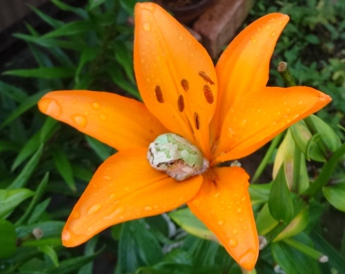 午後の気温は29度・・・ 家の中は北側の窓から涼しい風が入ります。 期待したほど雨は降らず木の下などは乾いたままです 降らないよりは良かったかな。 百合と雨蛙・・毎年のこと、百合 カラー 薔薇などの花に乗って カメラモデルになってくれる我が庭のアイドル雨蛙のミドリちゃん♪。 チロリアンランプ・・朝 明るくなる頃に撮りました マリーゴールド・・自家採取の種で蒔いたもの。 マーガレット・二番花です。もうすぐ七月 このままでは夏越し無理。 挿し芽で猛暑を乗り切りますよ(笑) ガーデンシクラメン・・六鉢残っていますけど、 今年は何鉢 夏越し出来るでしょうか? 天候任せです。 公園の花・・ビヨウヤナギでしょうか、 家にあるキンシバイとは蕊が違います。