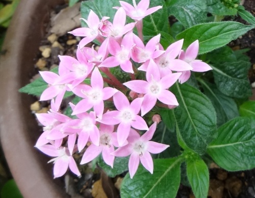 午後の気温は28度・・・曇り日です。 私の一番好きなブルーの紫陽花が元気がなくて・・・ 木を揺すってみたらグラグラ、こんな場合はコガネムシの幼虫が犯人! 鉢から抜いたら大きく太ったのがゴロゴロ・・根っこは殆ど齧られている。 例年は1月末ごろに植え替えるのですが今年は手抜きしたのです。 花を落し切り詰めて植え替えて置きました。 あの大きく育った幼虫は、いつ飛び立って成虫になり 植物に卵を産み付けるのでしょう? 度々の被害にうんざりです。 昨年の春、ペンタスの苗、ピンクと赤色の二色を購入 それを挿し芽で冬越しさせて、やっと開花しました、(^-^)/ 挿し芽から育っているペンタス・・ ペチュニアの種を採っておき春先にパラパラと零しておきました。 摘心はしましたが植え替えて無い(笑) 昨年のブログで調べると 色の濃淡の変化があるペチュニアでした。 今はこの色。 この子は、だ~れ? 大輪になれば家の子です(笑) 好きなサーモンピンクの花は挿し芽で冬越し、 昨年と同じ顔で咲いていますよ。 インパチェンスの零れ種の発芽・・・此処は開花鉢の置き場。 台座の上では紫陽花や花菖蒲の鉢が並んでいる。 肥料分のある零れ水で、手も掛らず都合のよい場所です 今年は発育が遅いです、昨年は早いのは咲いていました。 小さな苗ですけど、見えますかしら。猛暑を避けて秋の開花が 一番綺麗です。上の方は松の枝が伸びて丁度よい日陰ができます。