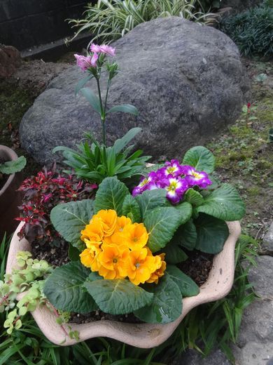 今日の気温は12度~21度・・・昨日よりは随分と暖かいような気がします。お日様ニコニコの日、ビオラとノースポールを花壇に直植えにしました。小さな苗ですけど・・ひと手間省きました(笑) 先日 産直広場で購入の苗で 寄せ植えの二鉢目を作りました。 白と薄いピンク色のこの金魚草に魅せられて・・・ 可愛いねぇ~満足♪ 昨年は普通サイズのシクラメンを購入して失敗~! 次は何とか夏越しさせようと・・(笑) 二年目を自分の手で咲かせるという自己満足を味わうために ミニなら丈夫かな?と考えたのです。 ベニジュームのオレンジ色です 苗が小さいからか、1ポットに2本植えでした。 大きく育つので一本は花壇植えに、後の一本は鉢植えに・・。 エンドウのようなのは付いて来たのでそのまま・・(笑) 小さな花を咲かせ続ける私の薔薇、