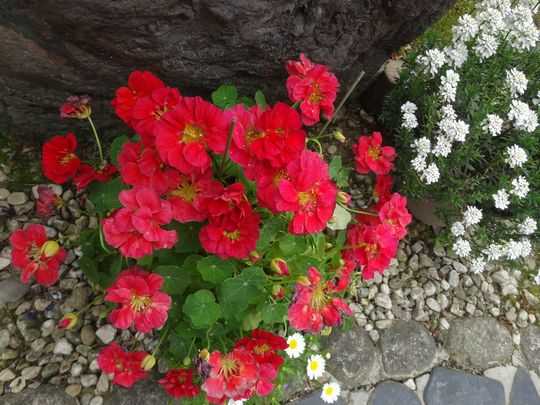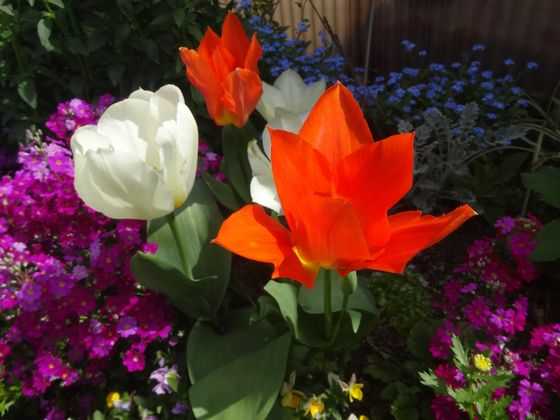 今日の予報気温は20度~10度・・・ 朝 五時頃目覚めた時は寒い~と感じましたけど それから又 ひと眠り~! 毎朝の起床は6時半 夏になると5時起きしますけどね。 風が強くて午後も体感温度は15度ぐらいかな? 昨日は朝九時から近所の友人達と喫茶店へ・・・ 喫茶店からスーパーへ直行した方が近いので 終わった後は食品スーパーへ買い物に・・・ お昼に帰宅して急いで昼食を済ませて一時からのクラブへ・・・ 終わった後 館外でお喋り♪ 帰宅は3時半過ぎ・・・疲れてゴロン~ 室内で冬越しをさせたナスタチュームです たくさんの花が咲いています ナスタチュームの発芽 種を埋めて置いたのは3月初めだったような・・ 発芽4本 次の開花は5月と予想していますけど・・ ペチュニアの大鉢と金盞花の鉢植え、マラコイデス。 バーベナの花が次々とよく咲き続けています 西花畑のチューリップと百合の鉢植え4鉢 大きく育ってきました。 佐渡のユリが二鉢と八重咲百合の赤色と黄色 右端がヒメウツギの花。 風が強くてブレブレです。