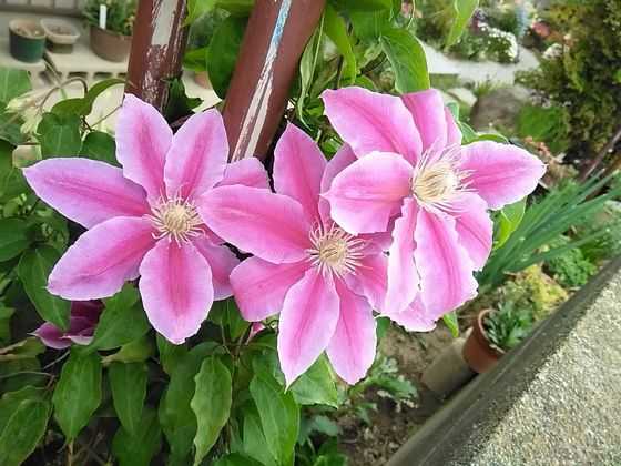 今日の予報気温は15度~23度・・・ 午後から強風がピューピューと吹き荒れている。 昨日はブログ投稿を終えてから友達にラインして 散歩に出ませんか? すぐに返事が来て10分後に所定の場所で・・・ このMさんとは喫茶店ではなくて歩きながらのお喋り♪ 昨日は5500歩の散歩でした。 クレマチスの開花 物干し台の右側に巻き付いて毎年咲きます。 左側は夏になると朝顔の種を蒔いておくと 巻き付いて咲きますね(笑) 手抜きばかりしています。 オステオスペルマムの大株を 反対側から写してみました 根元にアシュガの花が此処にも咲いていますよ。 庭のコンロウバイの花 未だツボミかな? 地味な花ですけど好き♪ 白々と散っているものはハナミズキです 花壇植えの切り花用金魚草 一株で沢山の脇芽が出てこんなに咲いた♪ マリーゴールドの苗 採種したものを蒔いて置きました 菜園の矢車菊、 青とピンクと濃ピンク 三色咲いています。