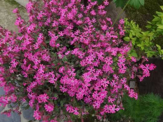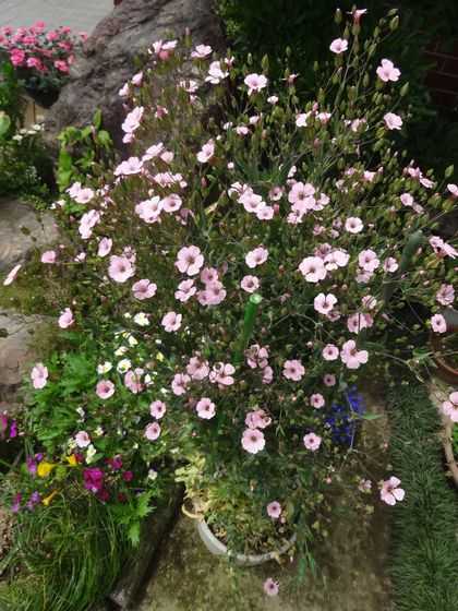 今日の最高気温は18度の予報・・・ 朝10時頃から雨が降ったり止んだり・・・ ダイアンサスの小苗を花壇の中で見つけたので 陽当りのよい所へ移植、珍しいサーモンピンクの花が 一個だけ咲いていたので期待です。 その種を採っても来年も同じ色とは限りませんけどね。 明日は雨量が多い予報を見たので、花盛りの鉢植えを 車庫の中へ移動しておきました。これで安心~ 雨の予報でペチュニア類の他、シレネも車庫へ移動・・・ ネモフィラの鉢は花も終りそうなのでこのままで・・・ リナリアも毎年、採種した種からですけど 好きな色の種を採り蒔いても同じ花色は出ません 西花畑で毀れから咲いているこの色が好きなのに・・ 家にも芝桜は植えているのですが メキシコマンネングサに負けて 全部でポツポツと15個ぐらいの花 三個そろって咲いていたので一枚~!(笑) 平戸ツツジ、一本の木でピンクと濃ピンク 時々白色も咲いたりしますよ。