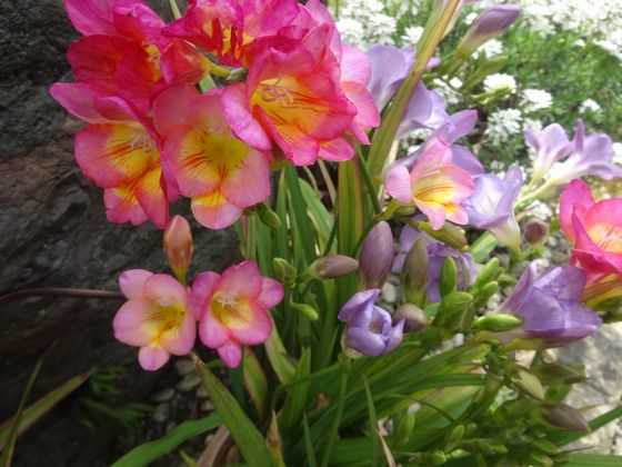 今日の予報は17度~7度・・・ 17度も有るとは思えない寒さ! 風が強くて寒いです、 庭の日向の方が暖かいかも知れません 庭仕事をする積りが寒いのでやめ~! 食品スーパーへ行きたいけど、これもやめ~! 紫色とピンク色のフリージャが咲いた、 紫色、少し色が薄いかな。 残念ながら本当の咲き具合はこんなもの・・ 球根を買った年も次年度も綺麗に咲いたけど 三年目の今年はこんな姿です 姉の家へ一鉢 届ける積りで植えたけど止めました。 黄色いフリージャはこんな場所で放任状態 それでも強い! バビアナの花が咲いた、 19年に購入 三度目の花です ネモフィラが風雨に叩かれて酷い状態になり もう抜こう、と思っていたら見事に立ち直りました~♪ スマホからPCデスクトップへ突然写真が取り込めなくなり 20日間ほどデジカメばかり利用 昨日からやっと何とか取り込めました。 庭の写真はデジカメで良いのですが、 遊びに出掛けたり散歩道の花などはスマホが便利です 両方 持ち歩くのは重いですからね。