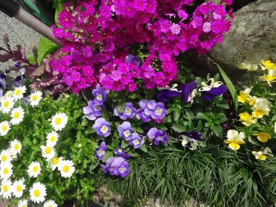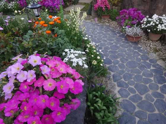 朝から雨、シトシトと静かに降り続く雨です。 時々 庭を眺めに出ては又 家の中へ・・・ マラコイデス等が今日は、びっしょりと濡れて垂れている 夏の花壇は何を植えようかな。 種蒔きの準備をしなければ・・・ 昨日、写した写真から、毎年似ている花々ですね 毎年 過密になる花壇です 種蒔きしたもの、挿し芽をしたもの、 隙間を見つけては植えこんでいますから~! 通路の花 金盞花とか、リナリア 毎年この位置で、 オステオスペルマムとかローダンセマム等は 宿根でいけるものは其のままで・・・ 今年は抜いて挿し芽苗で植え込まなくちゃね。 ムスカリの花 大好きだけど 今年は綺麗に咲かなかった。 そろそろ花も終りですね。 通路脇の庭石の上は花鉢置き場 白色が咲くかと思っていたペチュニアはピンク色だった! 咲いてみなければ花色は分らない私の花達です(笑) ツルハナシノブの花 ず~っと以前から家の庭の住人なのに すっすり忘れ去られている花、 これだけが残って咲いている、 青色も有るようですね、青もいいですね。 アネモネ、一株枯れたけど 青い花が綺麗に咲いて良かったです