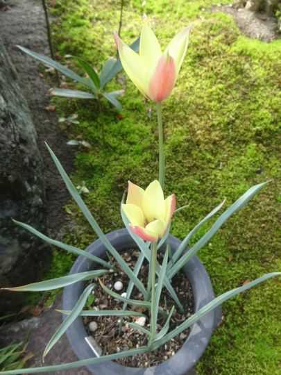 雨上がりの日で風が強くて寒いです。 暖房を入れています 気温は15度ぐらい、寒くて庭仕事もして居れません 昨日からよく降りました~! 昨日は孫娘からラインで今から婆ちゃんちへ行ってもいい?と。 お昼用にお寿司を買って来て~と返事しておいたら 3人で遊びに来ました。 お正月以来です、後でコロナは大丈夫かしら?・・ 心配になってきました。 高校・中学位だと症状なしですから怖い! 昨日の雨の日、軒下の花たち、 アークトチスが咲き始めました。 この花色と葉のシルバーが好きです オステオスペルマムに今年も部分的に こんな形の花が咲きましたよ。綺麗ですね 花壇の中から小さなチューリップが二本 花の形から原種チューリップの残り球根が咲いた? リビングストーンデージーの花 けっこう長い期間咲いて良いですね 初めて種から開花したものですけど・・・ 遅れて発芽した二本が、こんなに小さいのに 一つ咲きましたよ。 左の1cm程の小苗もツボミを持っています 可愛い~♪ですね~ 種取りをして来年も上手に咲かせたいです