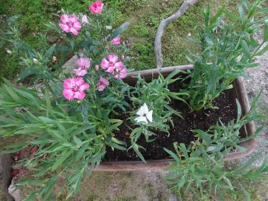 12株を一鉢に入れたまま咲き出したダイアンサス