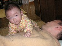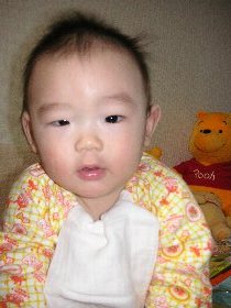 今朝。いつものように隆ちゃんが起きて元気に一人で遊んでいた。ぼぉ~っと見てて7時過ぎたら大体ミルクを作り始める。その間、パパが見ている★ミルクができたので、パパから隆ちゃんを受け取る。ミルクを飲ませた後、また遊ばせようとお座りさせると。。。あれ?なんか、いつもと違う感じ・・・ああ!!!!!!左の髪の毛が・・・・たってる!ねぐせだぁ~o(゚ー゚*o)(o*゚ー゚)o産まれて初めての寝癖が付いてましたw髪の毛があんまりなかったのでw伸びてきたのねぇ~((^┰^))ゞ テヘヘ 良かったね♪***********************************************記念に一枚★