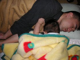 今朝。5時過ぎに起きた隆ちゃん。少し遊んでいるとお腹が空いたらしく6時少し前にはミルク。すると、すぐに眠くなったらしく脱力したのでパパの横に寝かせてみると、もぞもぞ・・・ちょっと動いてパパに頭をくっつけるとぴたっ!!と止まり、深い眠りにつきました☆髪が薄いから寒かったのかな???とにかく安心したんだろうな~(*^_^*)あはは☆かわいいな~