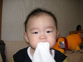 隆ちゃんはなるべく4時間空けてミルクを飲むようにしているんですが、離乳食は前のミルクの時間から考えて3時間~3時間半までにあげないとミルクを欲しがって、汗かきながらびぃ~びぃ~と泣きます。ちょっぴり我慢させてみようか?と様子を見ていると隆ちゃんは思い悩んだ挙句に・・・ガーゼを食べ始めました(+o+)ごめん。ママが悪かった(p_-)ママの都合に合わせちゃだめなのね・・・納得☆