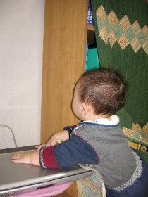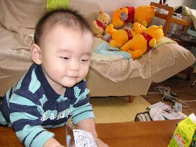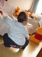 隆ちゃんはつかまり立ちが今ブームの様です。ローテーブルにつかまっては立ち、ソファーにつかまっては立ち、ママに捕まっては立ち・・・なんでも良くつかまって立ってみてます。今朝なんか、パパのPC台につかまって立って上においてあるモノをめちゃめちゃにしてました。。つかんで落としたり、よだれでべとべとにしたり★さっきも寝る前に、触って、、、キーボードとマウスを落として逃げてましたΣ( ̄ロ ̄lll)隆ちゃん・・壊さないでね( 一一)ママ怒られちゃうよ・・・