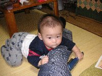 今朝。6時前には隆ちゃん起床。一人遊びだすwほっといても遊んでいるので遊ばせながらごろごろしていると「はぁはぁ・・」と隆ちゃんが近づいてくる気配・・・起き上がろうとしたら、ぶちっ!! ひぃ~(>_