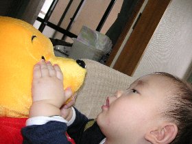 ここ最近。ぷ~さんを隆ちゃんの顔の前に差し出すとおでこをくっつけてきたり、CHU~したり、噛み付いたり。。。面白いみたいです(^。^)こんな感じでお口を持って顔を近づけてCHU!ってして欲しいのに、期待に答えてくれないときもあります((^┰^))ゞ テヘヘ