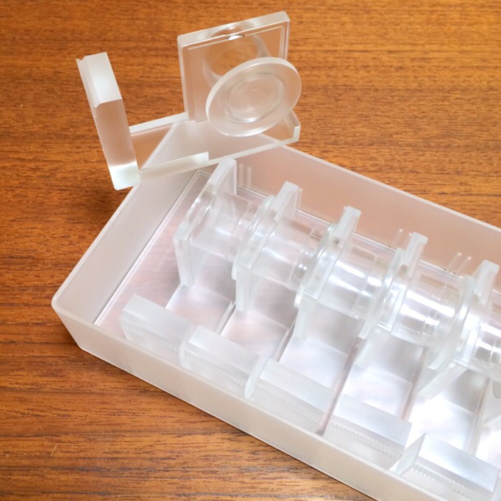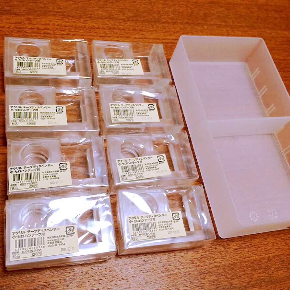 アクリル テープディスペンサーを8個と、PPデスク内整理トレーの100×200×40サイズ。