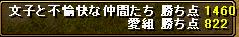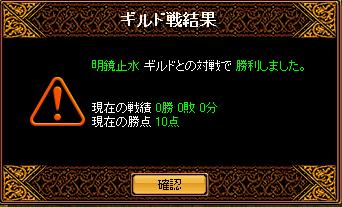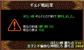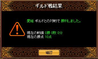 えーとまたまたキーロガー被害者が出ました。これでウチの面子だけで5人目・・・1PT編成で5人がロガー遭うとか運営さんまぢしっかりしてください。個人でそれなりの対策はとっていましたがやっぱりかかっちゃうんですねぇ・・・。みんなで協力して装備整えたり、お金あげたり色々大変。参加者9名相手方 2PTほど。久しぶりに面子そこそこ集まりました。亜茶さんの不在・作戦ミスなどちょっと不安な面が多数ありましたが、なんとか勝利できました。痛いし、相手2レクでレクかかりまくりでもう帰りたかったです。序盤でかなり失点しましたが、なんとか逆転することができました。久しぶりに白熱した楽しいGV。本当にありがとうございました。SSきちんと編集しなおしましたw