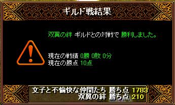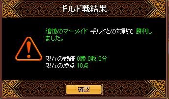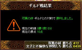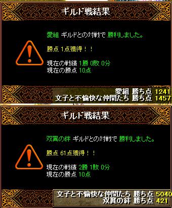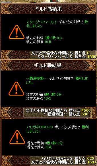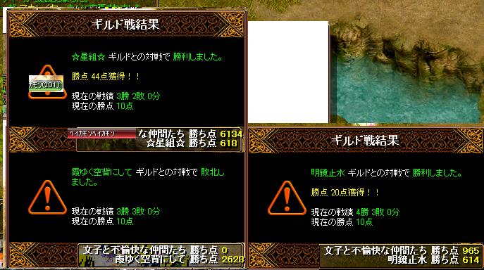 どうもリア充です←キーロガーなんてサイテーだ!!ロガーでウチのメンバー何人減ったことか…ウチのGでのロガー被害者が9人となりロガーによってのやる気の消失から活動を休止する方がまたでました。ですがウチの集まりもギリギリってところなので、ギルセンだけは無理を言ってでていただくことになりましたので、とりあえずは一安心です。ですがレッドストーンで、一緒に秘密行ったりテイムを手伝っていただいたりとその方々との活動はとても楽しいものであったので、それが今後なくなるということは大変残念に思います。ですが本人たちが決めたことですし、完全にいなくなるというわけではなかったので良かったです。そういう経緯から、色々とその方から資金・高価なアイテム等をいただきました。ギルド全体で使わせていただきます…本当にありがとうございます↓もし二人が出れなくなったら、ウチとしての活動を休止することになっていたかもしれません。本当に感謝です><では最近(?)のギルド戦の戦績↓あとSS取り忘れてしまったのが、sole_and_lune様点数は覚えていませんがなんとか勝利できました。3ギルドの皆様お相手ありがとうございました。またよろしくお願いします^^次は15日 明鏡止水様!前回は自分出られなかったのですが、動画をみる感じまたまたバグがあったそうで…。明鏡さんとのGVは2回連続でバグばかり…ほんと運営にはしっかりしてほしい。3度目の正直で普通にお手合わせしたいです。荒いながらの更新申し訳ありません>< ではでは(・ω・ )ノシ