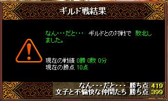 更新たまってたのでまとめて更新しますー。新世界様 210VS0 勝利 エース不在の中よくぞやってくれました。人数も多く全体的に硬かったです…。星の欠片様 3132VS813 勝利 こちらもエース不在の中よくぞやってくれました。人数は同じ程度。相手の剣士さん痛かったです。ただ某WIZが酔っぱらってて失点しまくったのが痛かったかなw 1WIZだったし仕方ない。明鏡止水様 得点なし 引き分け(?)RSのくそバグのせいでこちら・相手ともにほぼ全員鯖落ち・・・。復帰するも得点バグってどうにもならず。 結局再度再戦する形となりました。 自分含め、主力メンバーがキーロガー被害にあってしまい引退者もでてしまう始末。きちんとした対策ととっていても被害にあっている方が8月末~9月頭にかけてたくさんいらっしゃるようです。運営の対応もひどいですし、ギルドも解散してRSを引退することも考えましたが、中で仲良くなった人たちと関わりがなくなるのは寂しいですし、もう少し頑張ってみようと思います。お金が尽きたら自然と引退へとなってしまうと思いますが・・・。