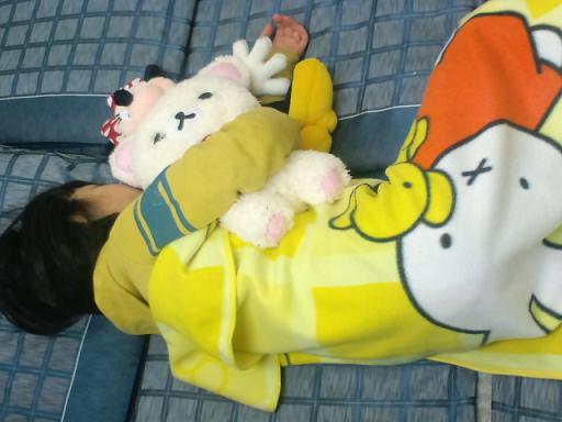事務所にもつれてきて、 昼寝するときも、ほらこの通り