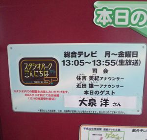 仕事をお休みして、スタジオパークに行ってきました♪やっぱりね、子猫ですから観れる環境なら観たいんですよ!子猫仲間のこてつさんと渋谷の駅で待ち合わせて、NHKさんへ向かったもののなんせ時間が早すぎました(笑)あれー?これしかいないの??という人数です。しばし外で待機。チラホラと集まる子猫ちゃん同士、和気あいあいしながら待つこと数時間。やっと10時になって、スタジオパークの中に入る事が出来てスタジオのガラス越しのセンターの位置を確保♪スタジオ内に入る抽選はさっさと諦めました。だってハズレたらスタジオの様子も観れない場所になるだろうしね。しばし待機してると、11時ちょい前に私たちが並んでる後ろを、洋ちゃんが通って控え室に入っていきました。(洋ちゃんがタイアリーで載せてたね)周りからは歓声と拍手が沸き起こるくらい、みんなのテンションアップ(^^)スタジオ内は、女性スタッフさんが洋ちゃんの代役となり、リハが行われてるのを眺めてたけど、すでに本人がいるかのように私たちも拍手をしたりVTRを観てわーきゃーと盛り上がってて、これまた楽しい!!!本番まで洋ちゃんには会えないのかーと思っていたら11時半過ぎに、料理コーナーの打ち合わせでスタジオ内に洋ちゃん現れる!もうみなさん、大騒ぎです。ガラス越しにいる子猫ちゃんたちにテレながらも手を振ってくれたりと応えてくれた洋ちゃん(^^)その時の服装は、フォトダイに載ってたチェックのシャツにジーンズ靴はピカピカに光ったシルバーの靴なのかサンダルなのか確認できず・・・。エプロンを付け、真剣に打ち合わせをされておりました!説明を聞きながら髪をかきあげた時は、もうわーきゃーもんです!!!スタッフさんに囲まれ、時折爆笑しつつ、腕を組んで説明を聞いてる洋ちゃんは日焼けをしていて、本当にカッコ良かったー。一通りリハを終えて、再び控え室に戻る時に、手を振ってくれました♪絶対ね、目が合った・・・・はず??(笑)12時になり、観覧の抽選が行われたけど、今日は20/437という驚異的な数字をたたき出したらしいですね。さすが洋ちゃんだわ・・。開始時間が迫ると共に、緊張して胃が痛くなりつつ、驚異的な運をお持ちのお客様たちが中に入り、いよいよ!!生放送中は携帯の電源を切らなくちゃいけなくてツイッター実況はここでやめちゃいました。放送中で映らなかったところをまとめると花道に向かうのも、一度観客の前を通らなくてはならない洋ちゃん。この時も照れてましたねー。カメラ向いてないとダメな人だからね(笑)スタジオに入り椅子に座ってVを眺めてる間も、Vを見ては爆笑の連続。どうでしょうのVを見てる時は、本当に楽しそうだったし亀山社中のVの時も、優しい顔で観てました♪話の後にVに入ると、すぐお茶を飲む光景が何度かあった。料理コーナーに入る前に慌ててエプロンを付けられ、慌てながら料理コーナーへ向かう。時間のない中で3品作るのは大変だろー。結局OA中にオムレツとうどんは作れずニュースを読んでる反対側では、休む間もなく料理を作ってる洋ちゃん。オムレツはちゃんと、右手でトントンしながらキレイに形を作ってて料理担当の方に軽くアピール(笑)何とか料理が完成して椅子に戻ってからは、エプロンを外し腕まくりをしていた袖もきれいに直してもらってました。(ボタンは自分で留めてたかな)放送時間が終わった後はぐったりする洋ちゃん!1時間では短くて不本意だったから、次回は2時間枠をくれとアピールした洋ちゃん。スタパのサイトに載る写真撮影が行われ、両アナウンサーと共にいつものファイティングポーズを撮ってみたり、フォトダイでもあがってたけど子猫ちゃんたちをバックに記念撮影♪薄っすらと写り込む自分(笑)最後は子猫ちゃんたちに手を振ってくれたり、ウインクしてくれたりと大サービスをして控え室に戻っていかれました。14時半過ぎまで控え室にいたようで、最後、帰る時も歓声が起こってましたねー。ザッとレポするとこんな感じです。終わった後はこてつさんとお別れし、たまたま病院帰りに渋谷を通過するしずくん♪さんと合流してお茶して子ナックス談で盛り上がりまくりな時間を過ごしました(^^)仕事を休むか悩んだけど、やっぱり行って正解だったー♪料理してる時もカメラマンの方たちも笑ってて、洋ちゃんはこうやってスタッフさんからも愛されていくんだーと思った瞬間がいくつも見れたのが嬉しかったし、なんてったって洋ちゃんが語るNACS話しが間近で見れたのは貴重でした!久しぶりのブログで、ザックリした内容でごめんなさい。また何か思い出したら追記します。すでに深夜1時40分。明日はディズニーで早起きなのでもう寝る!!!