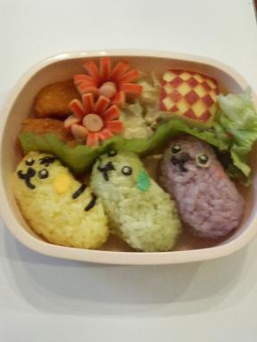 相変わらず、マイペースなブログの更新・・・先週小4の娘の校外学習がありました。琵琶湖に浮かんでいる沖島にいくとか。淡水湖に浮かぶ島に人が住んでいるのはめずらしいらしい。(日本では唯一この沖島だけだとか?)校外学習、お弁当がいるのでキャラ弁をつくりました。【豆しばの体】Seria(セリア100円ショップ)で購入のデコふり『紫』『黄』『緑』使用のおにぎりマルアイのデコふりです。ご飯に混ぜるとピンク・緑・黄・赤・紫色になるふりかけ5色いり。【豆しばの耳】玉子焼きをタピオカ用ストローでくりぬく。黄色の玉子焼き=卵の黄身だけ使用紫の玉子焼き=卵の白身に赤と青の食紅を溶いた水を少々緑の玉子焼き=卵の白身に緑の食紅を溶いた水を少々【豆しばの目、鼻、口】焼き海苔を にこにこパンチで抜いたもの。デコ弁キット。にこにこパンチパッチンしてにこにこ顔のできあがり!アーネスト にこにこパンチ3パッチンしてパッとかわいいお弁当アーネスト にこにこパンチパート最近作ったキャラ弁うさぎの親子弁当どうぶつの森 たぬきち弁当明日は上の娘の誕生日です。何のごちそうをつくろうかなあ。