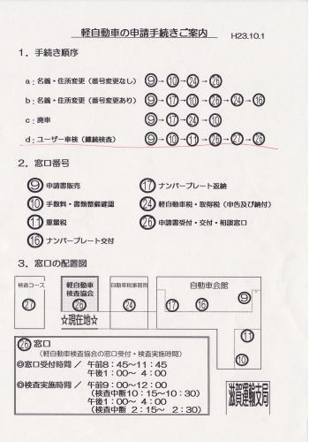 つづき・・・【ユーザー車検 《当日 書類編》】(【ユーザー車検《準備編》】 【ユーザー車検《当日 検査ライン編》】) ユーザー車検当日。軽自動車検査協会に 8時45分ちょうどに到着。 『書類の作成』まず、軽自動車検査協会窓口に「ユーザー車検初めてなんですけど・・・」と言うと必要書類「車検証」「納税証明書」があるか確認。そして『申請手続きご案内』の紙をくださいました d:のユーザー車検なので順番に窓口をまわって「書類を買ったり、お金を収めたりしてください」とのこと。 まず9番に60円を支払い、書類を一式もらいます。次に10番で持ってきた書類を確認され、検査費用1,400円を支払います。そのあと11番で、軽自動車重量税分(7,600円)の収入証紙をかって『重量税納付書』に貼り付けます。 すべての場所で「ユーザー車検初めてなんですけど・・・」と言うと丁寧に教えてくれました。 26番窓口に帰ってきてすべての書類を係りの人に見せます。最初の方とちがう方だったので、ここでも「初めてなんで・・・」というと「各書類を記帳台で記入してください」とのこと『継続検査申請書』 走行距離は10キロ以下は切捨て。 『自動車検査票』 『自動車重量税納付書』 (7,600円分の間違い・・) 『点検整備記録簿』これは当日この場所で点検するなら使用する書類。私はダイハツで点検してもらったときの『定期点検整備記録簿』を提示しました。 記帳台には、 「書き方見本」があったので車検証を見ながら記入しました。わからないところは、係りの人に聞きました。 持ってきた車検証 (この画像は車検おわってから新しくなった車検証です)納税証明と、以上を提出。窓口の方がそれぞれクリップで留めて、渡してくれました。 その書類をもって、いよいよ検査ラインへ ・・・【ユーザー車検《当日 検査ライン編》】へ つづく・・・ 【送料無料】脚マッサ-ジで、ベストカップル