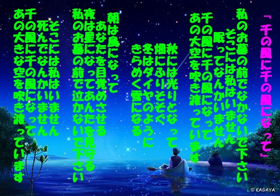 みなさんは、 「千の風になって」 という歌をご存知ですか?昨年末の紅白歌合戦を観たかたは、ご存知でしょうが、若いテノール歌手の秋川 雅史(あきかわ まさふみ)さんという方が歌ったことで、一躍脚光をあびましたね。私、この詩にすごく癒されるんです。もっとこの曲のことが知りたくて、ネットで調べたんです。 作者不明のこの歌は、IRAのテロの犠牲者となった青年が自分が死んだ時に開封するよう両親に託した手紙に残されていた詩だといいます。同時多発テロの追悼式ではテロで亡くなった父親を偲び11歳の少女がこの詩を朗読をしました。◇ 新潟出身の作家 新井 満さんが、“友人の奥さんの死”を知った折に アメリカ製の原詩を訳して贈ったものです。 そして、詩を訳したものにメロディを付けて 自作のCDにもしました。 そのことが新聞のコラムに取り上げられ、ついには映画にもなったのでした。 新聞コラム : 朝日新聞(天声人語 2003.8.28) 映 画 : 『天国への手紙』(南果歩主演)「私のお墓の前で泣かないでください。そこに私はいません、眠ってなんかいません。千の風に、千の風になって、あの大きな空を吹きわたっています。」という美しい詩をのびやかに丁寧に歌いあげ、大切な人を亡くした人に慰めを与えます。この詩の感じ・・・すごく わかります。大好きな その人を 思ったときここに あの人は いてくれる。同じ景色を見て、同じことを感じることができる。涙は自然に流れてくるけど、優しい気持ちになれる。そんんな 時が あります。 まりもん ↓ ↓ ↓ この歌詞をクリックしてください。 メロディが流れます。 (壁紙は、素材部屋からの転写)