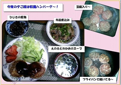 今夜の晩御飯は、豆腐バーグだぁ~。(*^_^*) 牛筋の煮込みは、私の大好物なの。 ひじきの煮物は、娘の好物。 豆腐ハンバーグは、柔らかくてお年より向き。 お腹一杯になったら、眠くなった。。。 だって・・・・・私も娘も、初出勤&初登校なんだもん。。。。 疲れた~。(*´ω`)≡З でも、私だけ明日は仕事OFFで、パソコン講座だぁ~。 仲間との再会で元気をもらうか。。 それとも。。。。。。。。 先生にしごかれて、余計に疲れるかなぁ~~。(~_~;) ☆ヽ(▽⌒)よろしく♪ お願いします。 (o*_ _)o))ペコ
