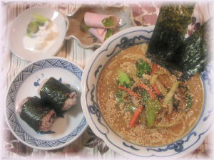 今日の晩御飯です。 ランチが、結構ボリュームがあったんで、ほしくないなぁ~。。。 と、自分が思ったら作るのもめんどくさい。。^_^; と言うことで、今日は手抜きご飯。 冷凍ラーメンだ~ でも見た目は、豪華そうでしょ?? *味噌ラーメン (冷凍ラーメン&タマネギ・チンゲンサイ・人参・ゴマ) *ハム巻きサラダ *おにぎり *キウイ&ヨーグルト ★調理時間・・・約10分 まぁ~、たまには良いか~。 美味しいって言ってたし。