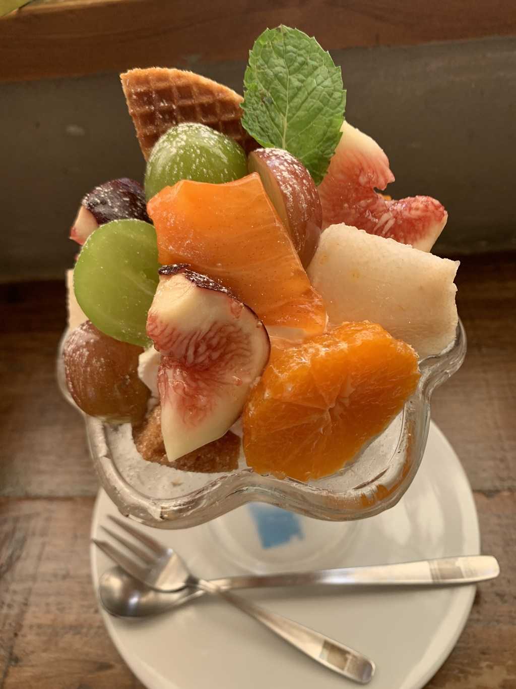 商品研究 「OSORA CAFE」のおまかせMIXパフェ 過去の勉強録より「OSORA CAFE」のおまかせMIXパフェ黒板にあった無花果を入れて欲しいとリクエストしています。黒無花果ネグローネ、有田のみかん甘い、鳥取の鬼太郎柿、生クリームがうまい、でかいサクサク、鳥取の梨(銘柄覚えきれず)、ブラックシャンマスカット富士の輝き、シャインマスカット、アイスクリーム、あいすくの下には鬼太郎柿のジュレ
