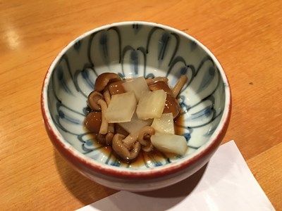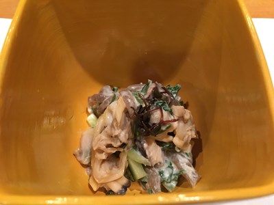 芹の他に胡瓜、椎茸、蒟蒻など、見事な包丁さばきで複雑なテクスチャが組み合わせてあります。
