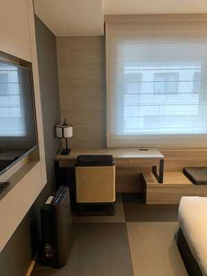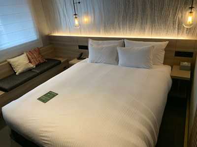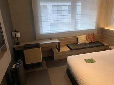 テーブルの横にソファーがあり、その前にダブルのベッドがあります。