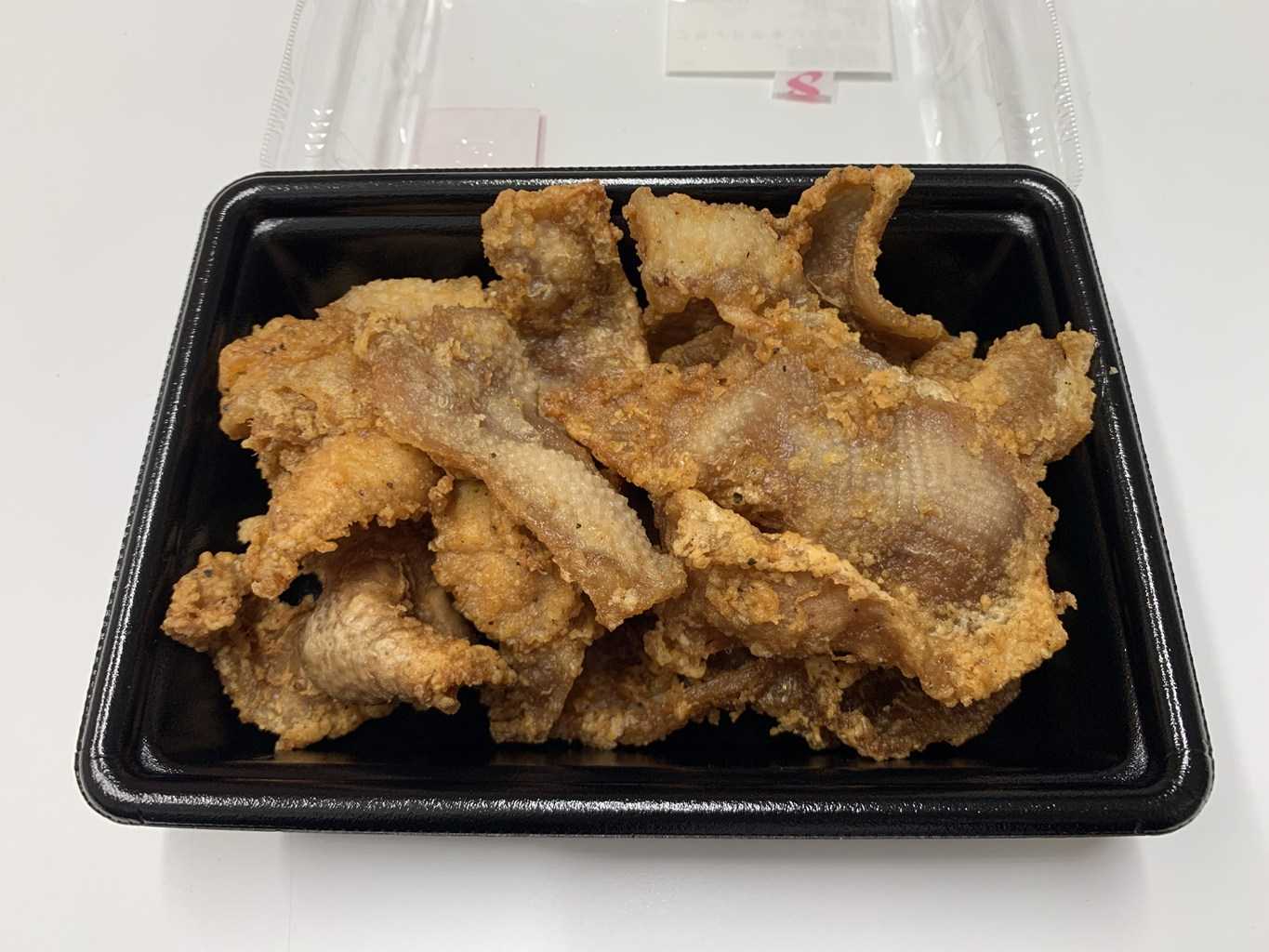 「原信 美沢店」の「フライドチキンの皮だけ」本体価格100gあたり198円、Pあたり245円を試食します。