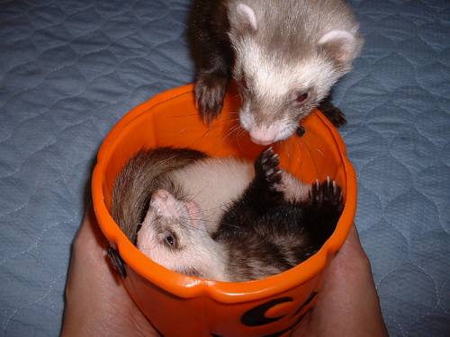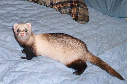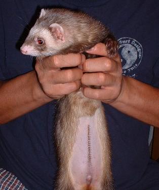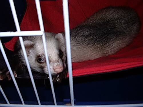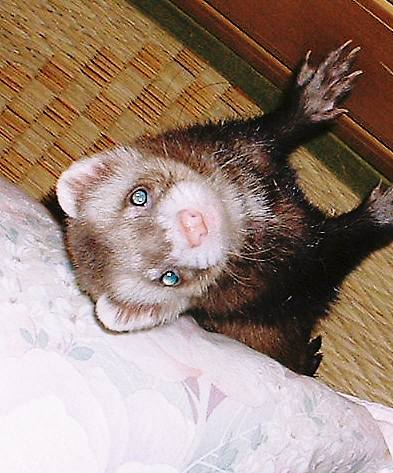 ジョーイ君。7/13(木)手術が終わり・・・今日で 9日経ちました。1週間での退院予定でしたが・・・・まだ無理でした術後の経過があまり良くなかった為、今だ入院中。イレウスの手術後は・・『普通は吐いたりしないので』と言われてしまうと、『帰してください。』とは・・言えませんでした。まぁ、中途半端で帰ってくるよりは、ちゃんと元気になって帰ってきてくれた方がいい。7/21(金)病院から夜 TELが鳴る。 『何事~??』と思いながら電話に出る。 手術前、腎臓&血糖値の数値が悪かったので、その後の血液検査をしました。 との連絡。 腎臓も血糖値も ちゃんと正常値です。と説明を受けた。 今日から、ふやかしご飯ではなく、カリカリフードに切り替え、 60粒中、30粒食べていると聞いていたので、また吐いたりしたのかな?!と思い、 ドキドキしながら、先生から説明を聞いていた。 『もう、手術して1週間以上経っているので、 今週の日曜日を退院予定としましょうね』と言ってくれました。良かったジョーイが帰ってくる!!とわかった途端、一番元気になったのは・・・私。夜にもかかわらず、ジョーイのケージのお掃除&たまっていた家のお仕事・・・帰ってくる前に、全~部、終わらせとかなくちゃ!と はりきってしまった。主人は、私が始めた領収書の整理などを見て・・『明日ゆっくりやれば~~?』と言いましたが、興奮してしまっている私を見て・・ 『あ~、集中しちゃってるのね。いいけど明日は(仕事)朝6時出発だからね~。』と言い残し、寝てしまった。すべて終わらせ、久しぶりにぐっすり眠った気がした。明日、ジョーイが家に帰ってくる!嬉しい!今回の事で、ホントに反省しました。あたりまえなのですが・・・こんな苦しくて痛い思いは、もうこの仔たちには絶対させない。。そして・・今日7月22日は・・・初代フェレット 『うめ』の命日。我が家に最初にきた、ルビーファーのセーブル♂ 『うめ』。『うめ』がいなくなり、今日で2年経ちました。今家にいる モモ子も1年半良く遊んでもらったよね。とっても賢く、ハンサムな男の子でした。2004年7月22日・・暑い、夏の朝。『うめ』は虹の橋に旅立って行きました・・7歳でした。思い出すと、涙が出てしまいます・・・いつも天国から、見守っていてくれて、ありがとう。ジョーイのことで、バタバタしてしまって・・何も手につかず、中途半端な時間をずいぶん過ごしてきました。いろいろ迷惑をかけてしまった方・・ゴメンナサイねぇ。