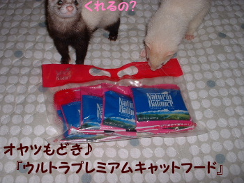 月一で頼む、イタチさん達のご飯♪ 本日、到着しました~あの1,000円は? 『レイくんのお迎え記念日☆』に主人からもらった1,000円で・・・おもちゃ購入♪さっそく、レイくんにプレゼントでもでも~・・・おもちゃの入ったビニール&ダンボールの方が楽しそう 怪しい緑色・・レイくんの『しっぽハゲ&背中ハゲ』の為、毎日オメガ3という、サプリオイルをあげているのですが。新商品?なのかな。メガオメガ3+6のオイルがあるので、購入してみた約5,000円 オメガオイルプレミアム いつものオイルは、ハチミツ色したキラキラっと、美味しそうな色のカプセル。何か違う・・・なにコレ??(食べ物なので、誤解しないで下さいね)新し物を購入すると、必ず食す・・・飼い主ですが・・・・↓これは・・ちょっと無理・・??。モモ子の調子の悪いときの・・・『緑色のうんP~!』色なのだ!!↑(でも一応舐めてみました。前のオイルより、舐めやすい。)とりあえず、3フェレに与えてみましたが、『うまうま~!』らしい。でも、食べ終わった後、口のまわりが緑色になるのは、どうにかならないものかなぁ。あたちの・・・ モモちゃんのお気に入りになってしまったらしい・・・《おまけ》ジョーイくんの『ヘン顔♪』*ひとり言*よくわからず始めた楽天Blog・・・。一人の友人が、『なんで楽天なの?』って聞くのですが、ココは楽天さんなので・・・ノーコメントにしておきます。でも楽天Blogって、フォト50MB使っちゃうと、それ以上は無理なのかしら?ほかのもよくわからないけど・・・まぁ、いっぱいになったらお引越しすればいいのね~♪