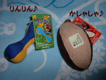 実は・・・yumeko家は、主人の両親と 同居しています♪一つ屋根の下で暮らすという事は・・・それなりに大変な事もありま~すが・・・もう慣れてしまいました昨夜 廊下でフェレットを放牧中義母が・・・二階にやってきた義母 『あら~!パレッコ♪と遊んでるのね~!!』 と・・・自信満々にいうので 『はいそうです。』としか言えなかったパレッコってなんだ??パレッコ?頭の中がその言葉でいっぱいになりました主人もその場にいたので 『パレッコってなんだよ!』 と逆に質問していた♪お義母さま面白すぎですそういえば・・・昔からフェレットの事を『ヘレッコ』とか『パラット』とか言っていた言いたい事はわかるので・・・・まあ~いいか!!(義母は、動物は嫌いではないようだ。でも前に、モモ子を見て『その顔は嫌いだけど・・・その毛皮の色ステキねぇ~』とモモ子をなでなでされた時は・・・ゾッとしました毛皮のコートと一緒にしないで~!)ニュ~おもちゃ? 先日作った『レイ君用ハンモ♪』の残った布で・・・・へんてこビーズクッション作製!! UFOみたいな形になってしまいましたでも、遊んでくれたのは・・・・レイ君だけでした~ ダンボ~ルの中身♪いつもレイ君が入って遊んでいる ダンボ~ルの箱に・・・なぜか モモ子が入っている。怪しい??箱の中をデジカメで撮ってみた。 ん?? 何かを抱えてる?? やっぱり~!星のおもちゃ!発見はい!没収ね~! ジョーイの体重 骨太のジョーイ君手術前は1600gもありました!←(決して、おデブではありません)でも・・・退院後1120gまで 体重が減ってしまいました仕方ない!と思っていましたが、お家に帰って来てから・・よく食べる!!たくさん食べて、たくさん遊んで、たくさんオネンネする仔は、いいこ♪です久々体重計に・・・・《おまけ》ティッシュの箱が大好きなレイ君ビニールをはがし、並べていると・・・必ず その上で くつろぎますその顔が可愛かったので・・・オマケの1枚親ばかですね
