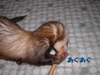 関東は・・昨日から大雨が続いている。涼しくなり、快適に過ごしているいたちさん達ハンモにもぐり・・・爆睡してるのね~。・・・でもね、誰か私と遊んでくださいな。とジョーイくんを起こしてしまいましたゴメンね! お気に入り♪ ジョーイのお気に入り『何かの棒』これを・・・隠してある所から持ってくると、ひたすら遊んでいるので・・・今日はママも一緒にあそんで~!!とラブコール一緒に遊びました(笑)間違って木屑など飲み込まないようにしているのですがジョーイって・・・『かなりのしつこさ』 この歯ざわりがいいのかしら??食べてしまいそうなので・・・没収 食欲♪ 『何かちょ~だい♪』のおねだりも・・・しつこいジョーイくん。『くれ!くれ!』と何かあげるまで、私の背中にしがみついたまま離れないのでBITS!のカラ箱に、キャットフードを数粒いれて、ハイ!オヤツよ!うまうま~♪冬になるまでに、体重元通り?になりそうな予感スリムになって、ビョンビョン飛び跳ねている方がいいと思うけどな?・・・手術後、自分のお肉を取り戻しつつあるジョーイなのです♪(現在1350g)記念撮影♪ ジョーイと、記念撮影した私。お目目くりくり~可愛かったので、画像upしただけです親ばか♪オヤスミ~♪ ずいぶん遊んだから・・・もうお家に入って、オネンネしなさ~い!なんて・・・飼い主が疲れきってしまっただけなんですがもう終わり??と見つめるジョーイくん♪お顔☆デカイですよ!また夜ね。