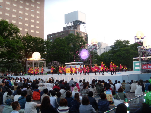 日中は雨も降らず、暖かい1日でした。その暖かさ夜に続き、とても良いyosakoi日和。このところ騒音問題に配慮して、かつての派手な前口上、太鼓、大音量の音声はなくなりました。会場は8丁目ステージに集約されたようです。(全ての会場を確認していない)それでも5丁目、6丁目には出店が並び、多くの見物者で周辺は賑わっています。この天気が週末まで続くことを祈ります。天気予報は土、日は晴れです。