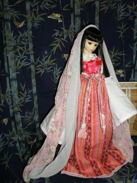 ちょっと暗く撮れていますが・・・いや、それとも・・・?こちらはまだ明るいうちに撮影した画像ですが、まだ裳が完成していません。白い唐衣もなかなか良い感じですね、今度、ののちゃんたちの唐衣も白に新調しようかな~。ミュウちゃんに新しいウィッグを購入しました。本当はさくらちゃんとお揃いの黒いウィッグが欲しかったんですけどね、これしかありせんでした。でもまあ、ミュウちゃんは瞳がブルーなのでブラウンの方がお似合いかな・・・さくらちゃんのウィッグが少々ずれています・・・。