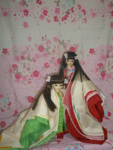 ミュウちゃんとさくらちゃんに五衣もどきの袿を装着させました。ああやはり平安衣装には襲ですね。 ごはんにかけて食べてみましたが、ごはんより餅のほうにあいそう・・・。