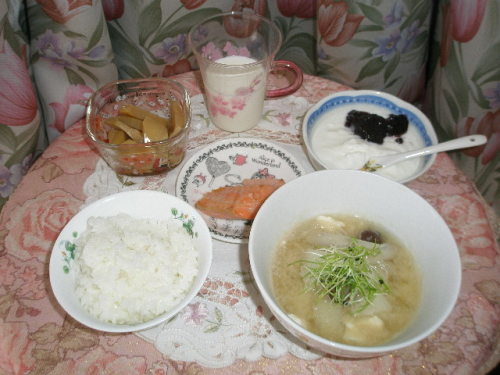 おいしっくすも最近目新しいものがないので、その食材でおうちランチにしてみました。牛蒡汁はヘルシーでしょう、ミニ大根は柔らかくて瑞々しいです。そしてちょっとお気に入りの糸ねぎをちょこんとのせました。 それと、筍の漬物と、鮭は残り物で、まろやかヨーグルトにはブルーベリージャムを添えました。牛乳の入れた後で上からドリップコーヒーをセットして注いだら分離しました・・・画像は一度混ぜましたので、その前は綺麗に分離していましたよ、 へ~え、新発見です。いつもは淹れたてのコーヒーに牛乳をいれてカフェオレにしていました。 孫ちゃんは昨日から幼稚園へ元気に行っています。なんでも満三才になる月から入園できるそうで、いまのところ三歳児は六人だそうです。これから増えそうですね。小橘の作ったはじめてのお弁当も ペロリと残さず食べてきたそうな。