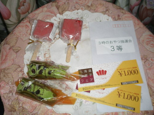 行ってきました、大通公園の二丁目会場で当たった3等のスイーツカフェ商品券2000円分です。五人のうちのひとりです。2等は5000円分三人、1等は10000円分ひとりでした。二等の人は途中帰ってしまっていた人もいましたが・・・。それと、三か所でもらってきた歩きながらでも食べられるスイーツ、妹のと二人分です。二丁目会場では、縦長のシュークリームのようなスイーツ、赤れんがテラスでは、キャンディ型のチョコ、東急では抹茶の和スイーツでした。どれも美味しい~。シュークリームは歩きながら食べてしまいました。あと、会場で食べたケーキ二個とドリンクで前売り 1200円でした。これならもう元は取ったなあと、いやそれ以上でした。 その大通二丁目会場です。ケーキなんですが、早めにいかないと売り切れです。お目当てのグランプリはちみつババロアもプリンパイもすぐ完売してしまいました。 なんだかなあ・・・食べたいケーキがすぐ売り切れなんて、これならケーキ屋さんで食べたほうがましです。ケーキは半分づつ妹とシェアして食べました。お昼を抜いてきた妹が追加で頼んだパスタサラダですが、量も少ないかなと。他にもピザとかは購入できます。でもまあ、三か所のお土産ももらって、三等賞の商品券も当たったしホクホクです~。 その後、丸井さんで開催中のお菓子の美術展へ立ち寄りました。素晴らしいでしょう~、目の保養です。 会場へ入る前に花フェスタも見てきました。とても暑かったです・・・でも、いいですね~。ウェディングドレスまで飾ってありました。