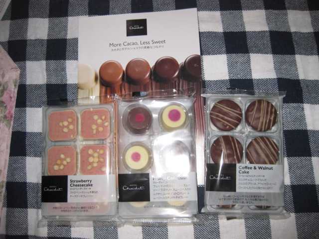 先日お話ししました「ホテルショコラ」というチョコレート専門店へ行ってきました。カフェといいますか、イートインも併設されていまして、行ったときはほぼ満席状態でした。左からストロベリーチーズケーキ、コーヒーウォルナッツケーキ、フルーティコレクションです。あっ、間違えた、真ん中と右が逆でしたね。↓の説明もそうです。説明文によりますと、ストロベリークリームを重ねたチーズケーキフレーバー、ミルクチョコレートで包んだクルミのプラリネとアラビカコーヒーにローストしたクルミをさらに加えて、フルーティコレクションの方はブルーベリースムージーとラズべりスムージー入りミルクチョコレートとストロベリースムージー入りホワイトチョコレートです。このシリーズは一袋六個入850円ですが、三つで2000円でした。まとめ買いしたら少しお得ですね。英国から来たお洒落なチョコレート専門店ですよ。