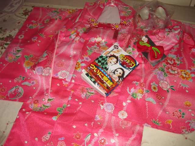 昨日、イオンの本屋さんで買ってきましたよ、最後の一冊。これで店頭では完売でした。ああ、よかった、あともう少し遅かったら手に入りませんでした。二冊残っていたところに私より先に女の子が一冊持っていきました。なんでも東京の大きな書店では予約のみで完売のところもあったとか・・・。ところで、和繋がりということで、姫ちゃんの七五三の着物をやっとアップできました。タイミングが合わなくて延ばし延ばしに・・・姉から譲ってもらった着物なんですが、ピンク色でとてもかわいくて綺麗な着物ですよ~、仕付けもあるのでまだ誰も袖を通していないものでした。七五三は来年ですが。そういえば、鬼滅の刃の禰豆子の着物もピンク色でしたっけ、ふふっ、羽織はありませんが、これで禰豆子のコスプレでもできそうですね。確か、竹の筒のようかんってありましたけど、今度買ってあげようか~、孫ちゃんにはしゃべる日輪刀を買ってあげたらそれで鬼滅ごっこができそう~。あっ、私は何役? 鬼婆?