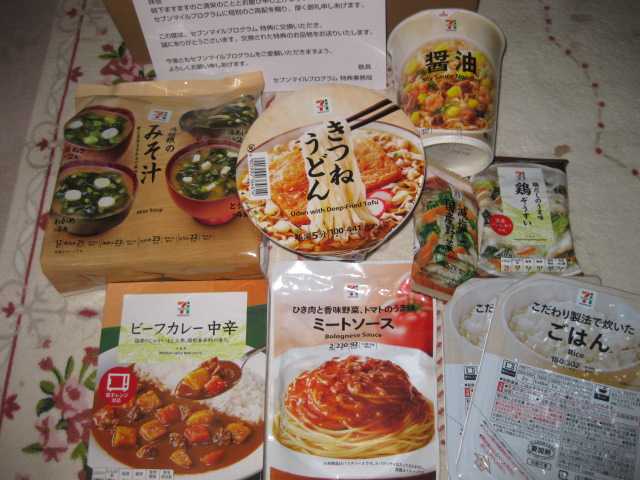 届きましたぁ~、セブンマイルプログラムの特典のインスタント食品のセットです。セブンでの買い物やネットスーパーやミールなどを使ったら勝手に加算されていくセブンマイルプログラムですが、今回、はじめて特典交換してみました。このセットならいいでしょう~、そういえば、小橘もこのセットに交換したとか言ってたなぁ…届いたのかな。