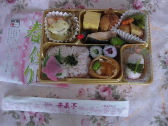 彩りが春らしいですね~。弁菜亭の駅弁です。お花見の賑わいと華やかさを盛りつけましたと書いてます。自家製の桜餅まで入っていました。