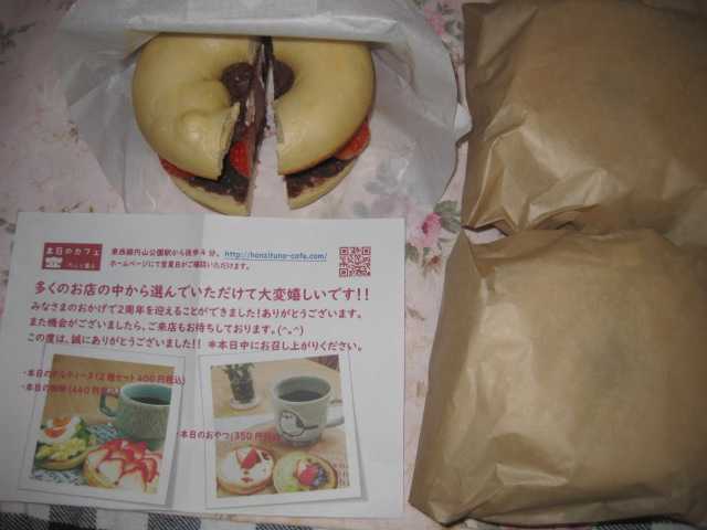 円山公園からなので配達料がちょっとかかるため躊躇していた本日のカフェのベーグルですが、ただいま配達料無料のキャンペーン中なので頼んでみました。凄いボリュームですよ、最初から半分に切れています。この半分でちょうどいいかも・・・孫ちゃんとボス橘にも一個ずつ取ってしまいましたが…。美味しいです。あんこと苺は合うよね。小ぶりのサイズもあるみたい。