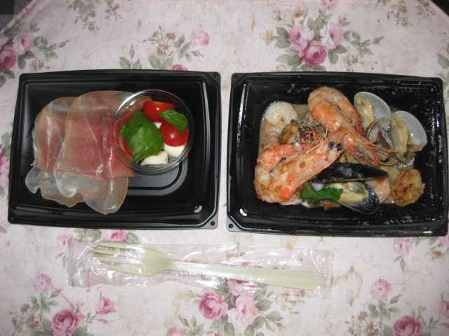 東区のジョリーパスタというお店から届けてもらったこちら、熟成生ハムとカプレーゼと漁師のガーリックソテーです。パスタ専門店からパスタではなく前菜のみを届けてもらったという…。11時オープンでしたので、その時間に行ってみたら、一時閉店だったのです。いつ開くのかわからなかったので、さっさと昨日の食パンの耳を食べてしまいました。ちなみに30分後にオープンしたので、副菜といいますか、前菜のみ届けてもらうことにしましたよ。ボス橘がガーリックシュリンプが食べたいと前日言っていましたので、ちょうどよかったです。でも、ピッツァハーフのマルゲリータとクワトロフォルマッジのピザが食べたかった…またいつか頼もう。