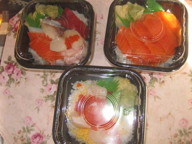 リーズナブルな海鮮丼のお店です。ちなみに左上からそのままの海鮮丼、右がサーモン丼、下が、帆立イクラ丼です。すべて800円台なので、ランチにちょうどいいですね。おっ、ローストビーフ丼まである・・・。