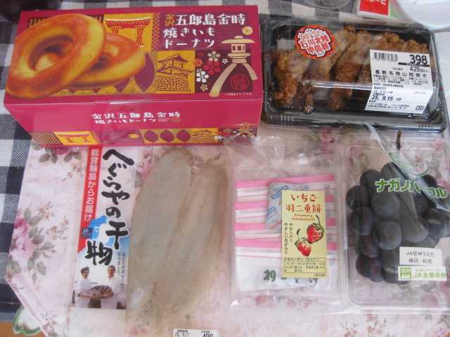 楽宅便で届けてもらった昨日までイオンで開催されていた石川北陸甲信越フェアの食料品です。まず、五郎島金時の焼きいもドーナツ・長野名物山賊焼き・能登輪島のいしる干しふぐ・イチゴの羽二重餅・ナガノパープルです。念願のナガノパープルを見つけたので嬉しいです。ドーナツ好きの姫ちゃんのためにドーナツは数個冷凍しました。羽二重餅は昔柳月の羽二重餅をたまに食べていましたが、最近は見かけなくなりましたね。