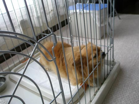 ケージに入れられてちょっとふて腐れ気味のチロです。姪の赤ちゃんのお祝いを届けに行ってきました。